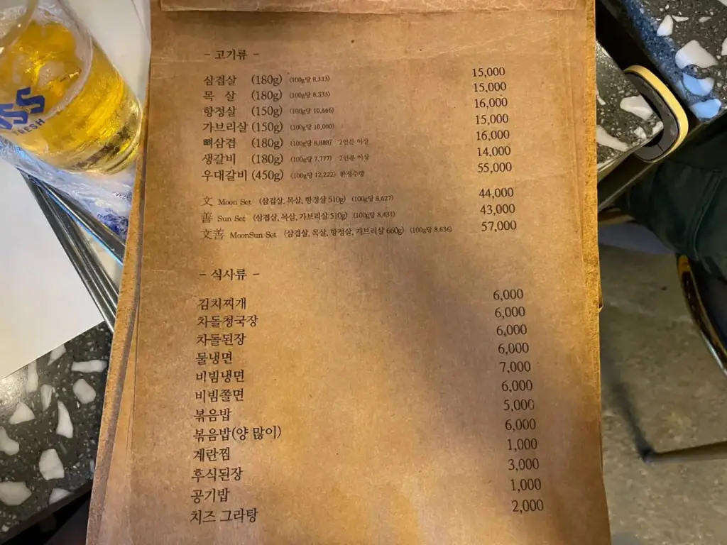 메뉴판을 보면 우대갈비를 중심으로 삼겹살, 목살, 항정살 등 기본적인 고기 메뉴들이 깔끔하게 구성돼 있습니다.